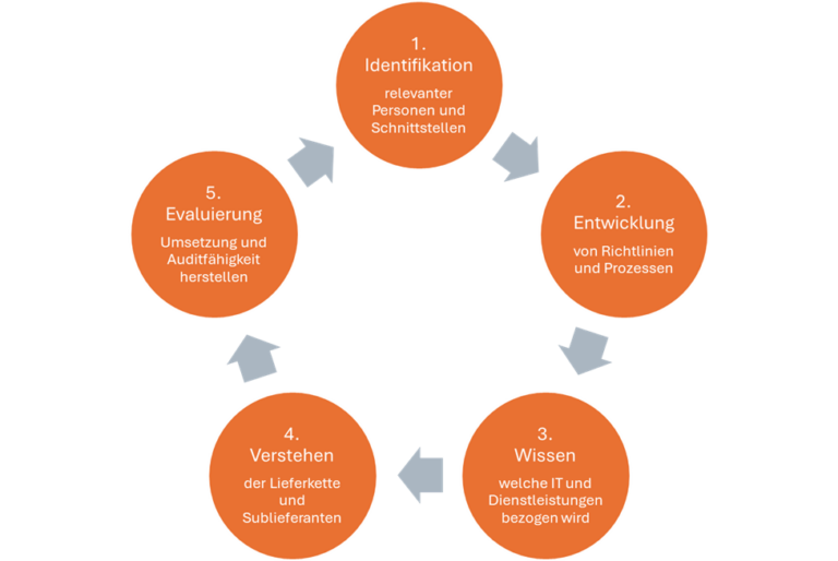 Mit Hilfe der fünf Schritte lässt sich ein angemessenes Management von Gefahren in der Lieferkette aufbauen, um das eigene Unternehmen vor Cyberrisiken zu schützen.